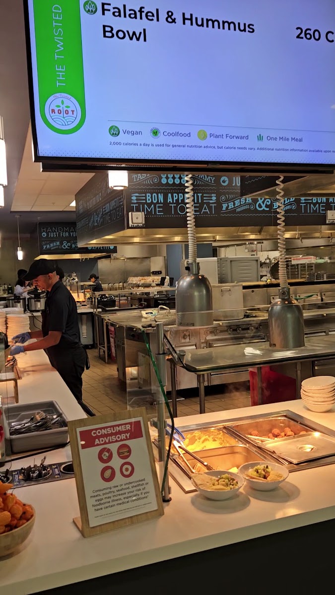 Lovely options. More options Monday - Thursday. Fantastic hot coffee brewer with milk options. Entrees at 'Home' are excellent, with comparable vegan options. The salad bar also is great, similar to Brandywine dining hall. I love the fresh cut fruit.